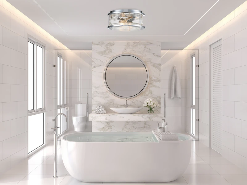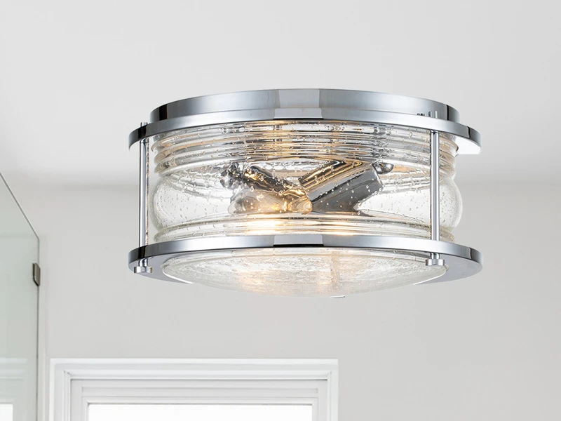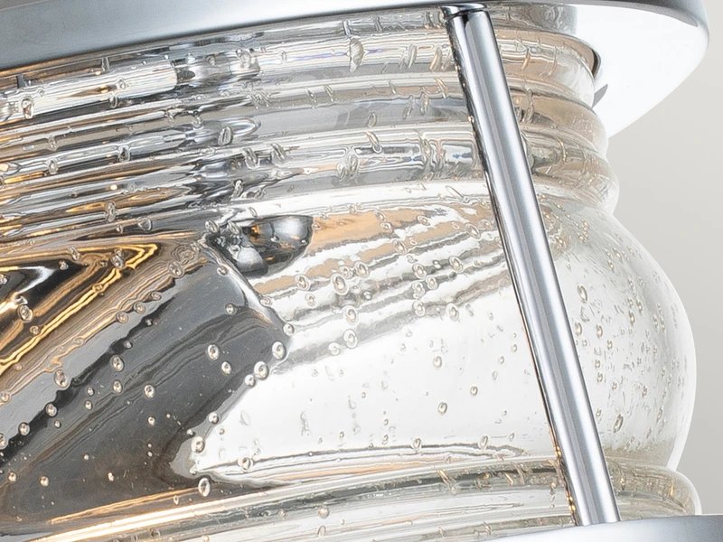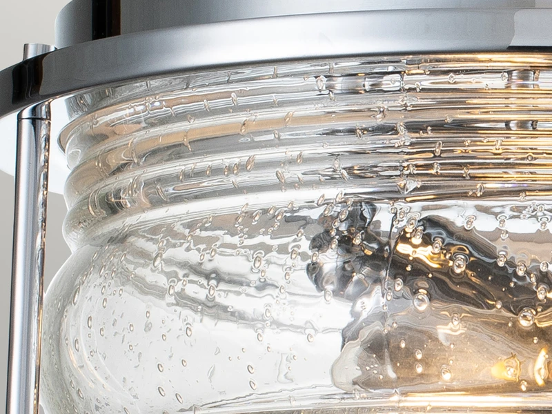 Langweilige Badbeleuchtung war gestern! Diese ausgefallene Innenleuchte im Industrial Style besticht durch ihr ausgefallenes Design und ihre hochwertige Verarbeitung. Der Korpus der Leuchte besteht aus Chrom farbigem Stahl, der Lampenschirm aus strukturiertem Glas.