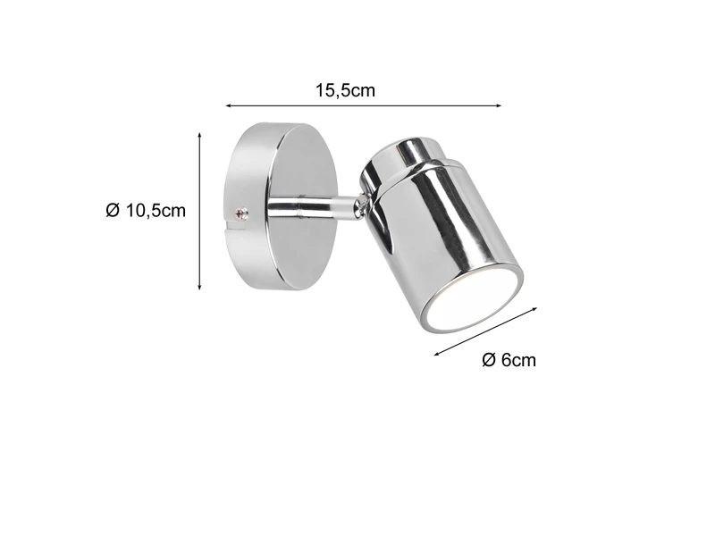 Der Strahler hat einen Durchmesser 10,5 cm und eine Ausladung von 15,5 cm und ist für die Montage an Wand und Decke geeignet.