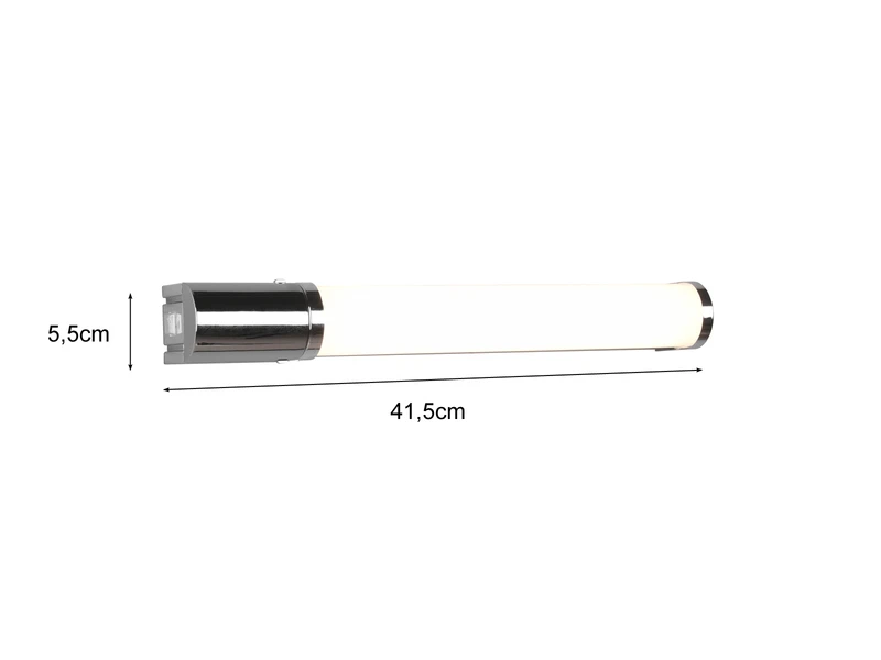 Durch das zeitlose Design und das dezente Farbkonzept in Chrome harmoniert die Leuchte mit nahezu allen Einrichtungsstilen und fügt sich mit einer Breite von 41,5 cm und einer Ausladung von 7 cm gekonnt ins Wohnambiente ein.