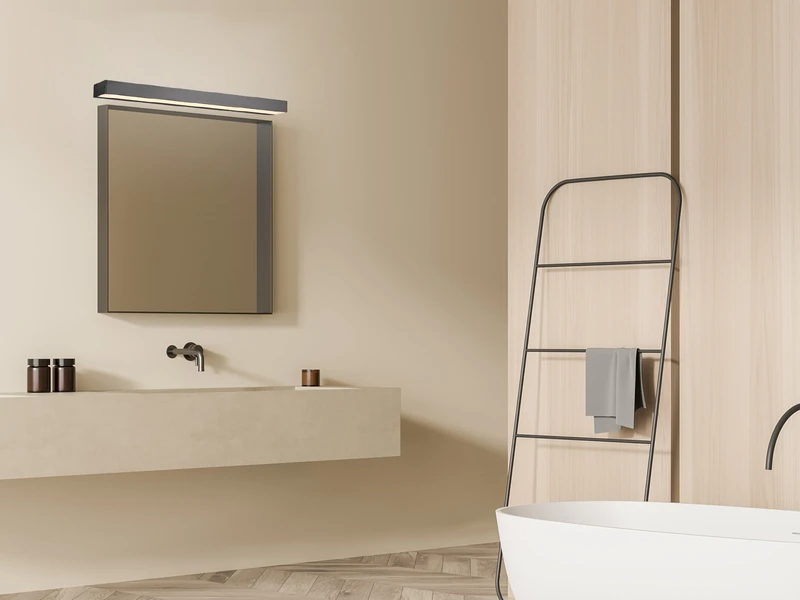 Der Schwarz matte Korpus verleiht der Badezimmer Lampe eine dezente Optik. Mit einer Breite von 60 cm und einer Ausladung von 8cm kommt sie auch in großen Bäder gut zur Geltung und überzeugt durch effektives, aber dennoch blendfreies Licht.