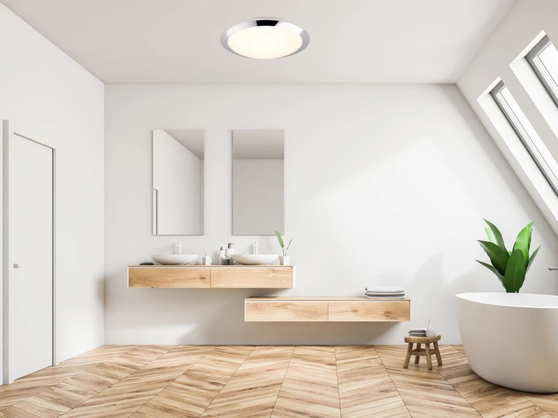 Dank Schutzart IP44 ist die Lampe gegen Spritzwasser geschützt und damit perfekt für alle Feuchträume, wie Badezimmer und Gäste WC geeignet. Die edle Optik in Silber Chrom und Weiß, unterstreicht den minimalistischen Einrichtungsstil und sorgt für ein helles, freundliches Ambiente. Dabei hat die Lampe einen Durchmesser von 29 cm sowie eine Höhe von nur 8 cm.